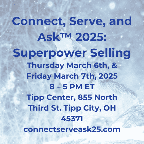Don’t miss out on this unique opportunity to redefine your professional development journey and forge the essential connections that will drive your success. Register now for the Connect, Serve, and Ask™ 2025: Superpower Selling conference, and join us on March 6th and 7th in Tip City, Ohio. It’s your chance to unlock your potential, engage with industry leaders, and become part of a vibrant community dedicated to growth and excellence. Spaces are limited, so act now to secure your spot and take the first step toward transforming your future. We can’t wait to welcome you to this unforgettable experience—register today and begin the path to enduring success!